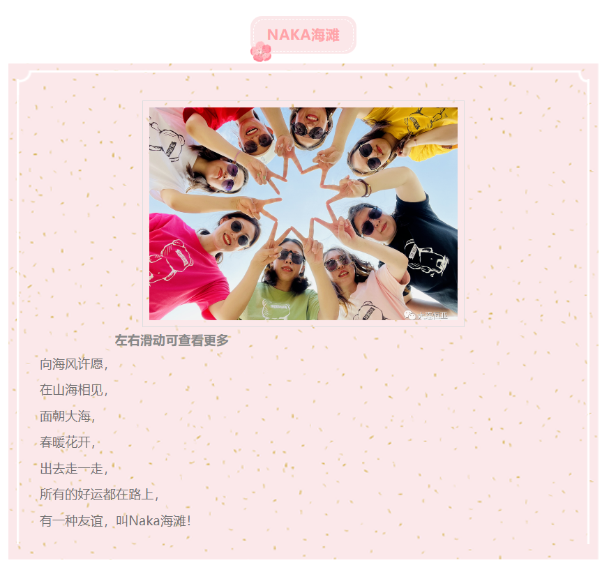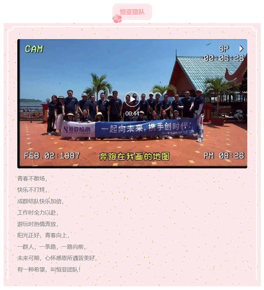 青春不散場, 快樂不打烊, 成群結隊快樂加倍, 工作時全力以赴, 游玩時熱情奔放, 陽光正好,青春向上, 一群人,一條路,一路向前, 未來可期,心懷感恩所遇皆美好, 有一種希望,叫恒亞團隊!